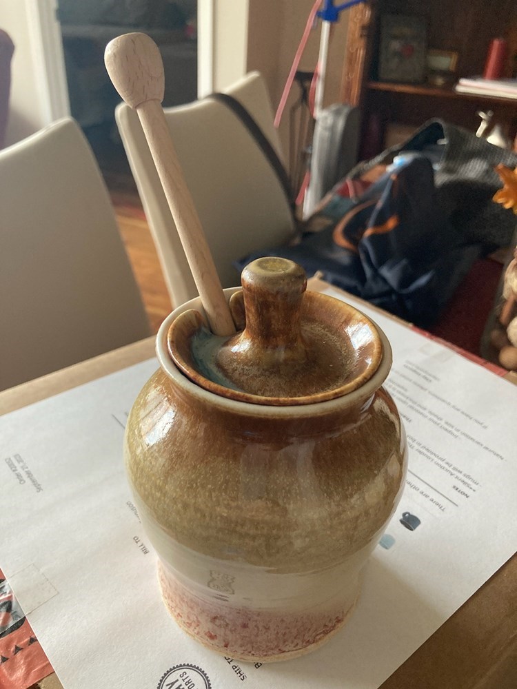 Handmade ceramic honey pot by art April Burk at Center of the Earth Ceramics. Check out more of her work on instagram @centeroftheearthceramics